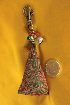 Elégant élément de décoration pour vos clés ou votre sac réalisé en coton brodé à la main aux motifs Hmong. Des perles de couleur et une clochette ornent le haut de l'objet.